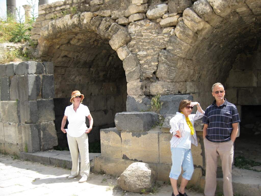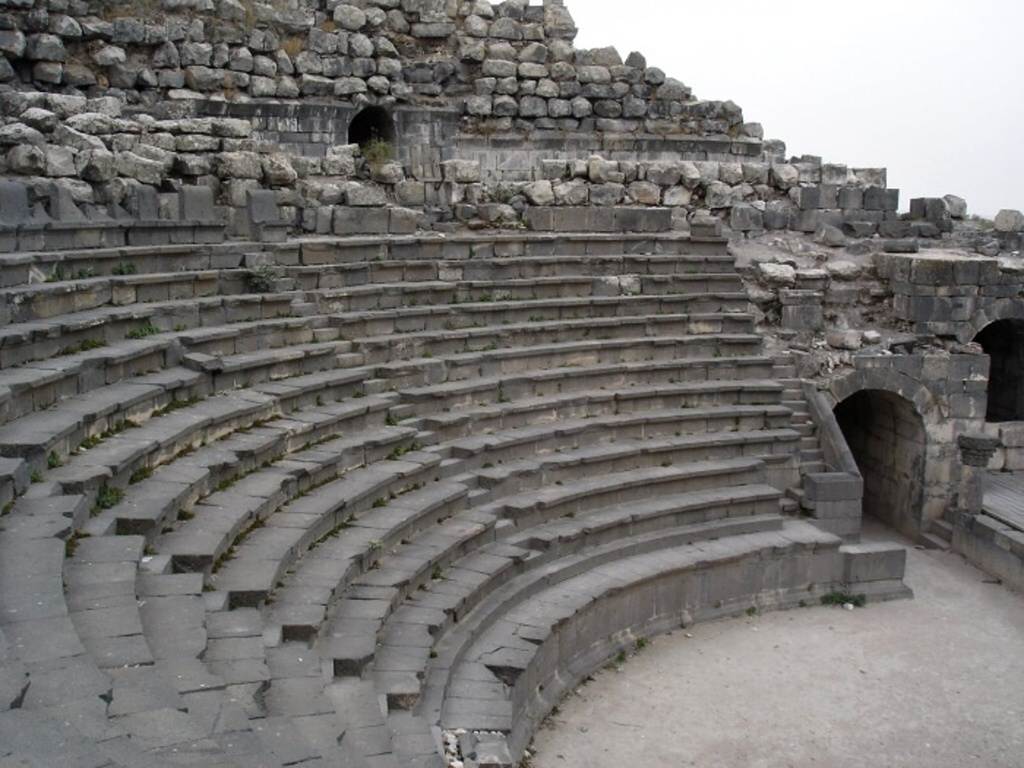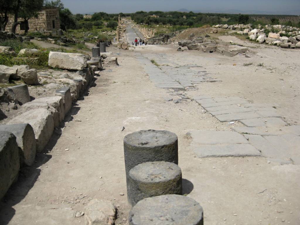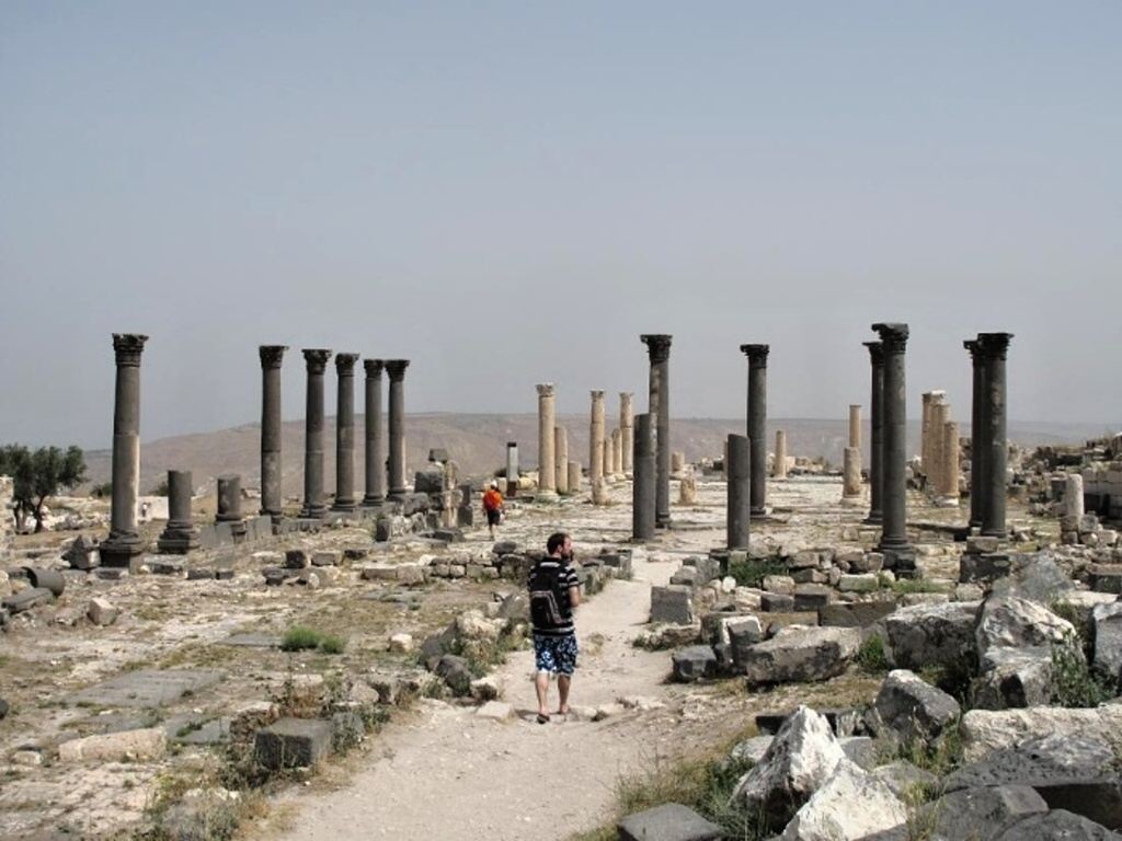 Die eindrucksvolle Ruinenstätte von Gadara ist bekannt wegen ihrer beiden Theater. Das Nordtheater, das einst 6 000 Besucher aufnehmen konnte, ist heute leider zerstört. Im teilweise noch erhaltenen Westtheater aus schwarzgrauem Basalt fanden etwa 3 000 Besucher Platz. Über die einstige Hauptstraße, dem 14 m breiten Decumanus ( Hauptorientierungsachse) gelangt man zur Hauptsehenswürdigkeit Gadaras, einer aus dem 6. Jh. stammenden byzantinischen Zentralkirche. Beeindruckend ragen heute die dunklen Basaltsäulen der oktogonalen byzantinischen Kirche in den Himmel.
