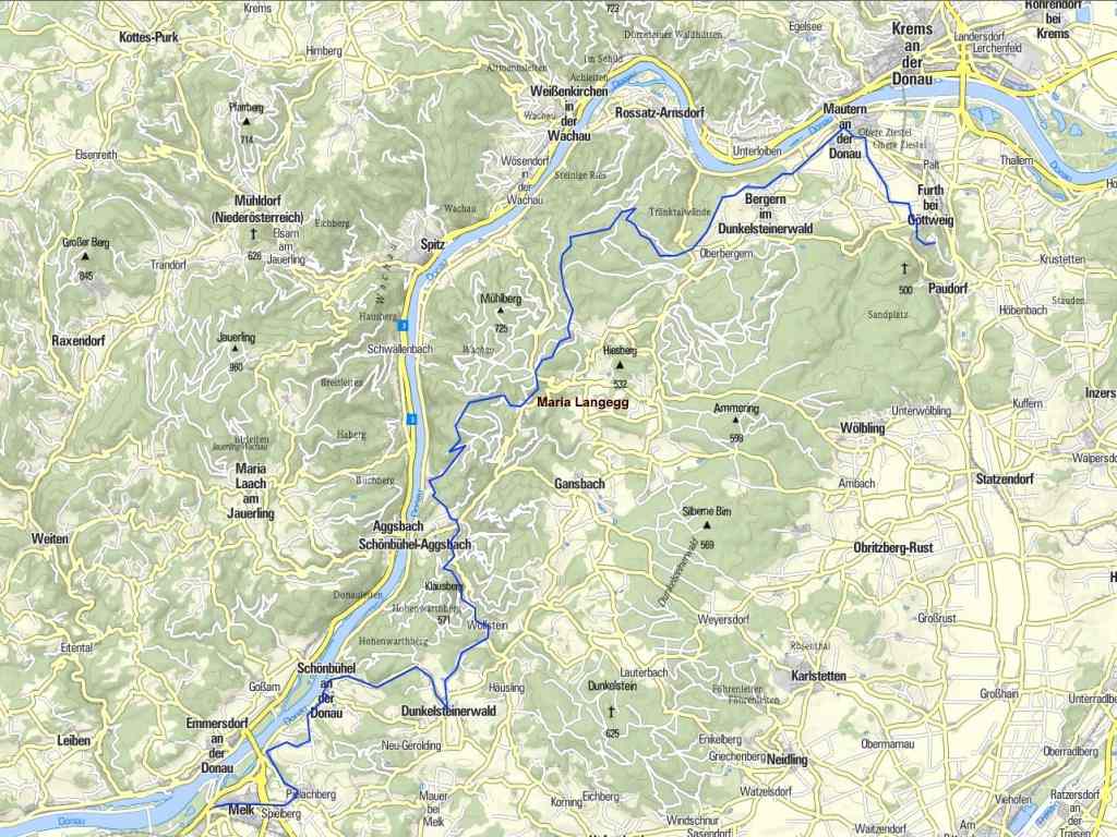 Von Maria Langegg über Schloss Wolfstein nach Stift Melk ist eine Wegstrecke durch den Dunkelsteiner Wald von etwa 20 km zurückzulegen.