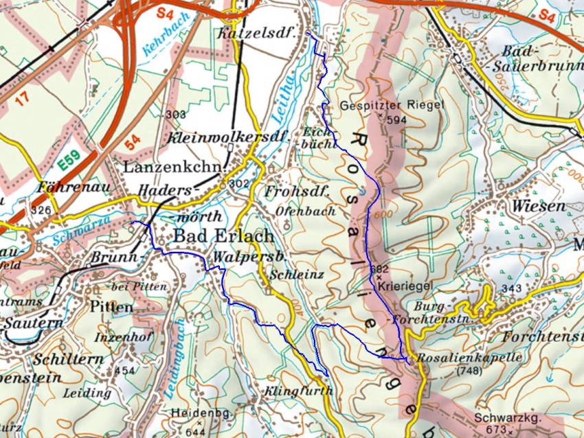 Startpunkt: Katzelsdorf, Schloss Endpunkt: Bad Erlach, Therme Linsberg Asia Länge: 23,6 km Aufstieg: 694 Hm