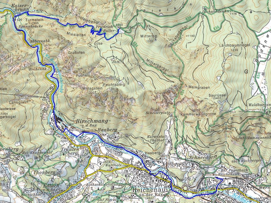 Die Schneeberg-Etappe beginnend in Payerbach bzw. Reichenau führt über Kaiserbrunn, vorbei am Turmstein und den Knofelebengraben und endet schließlich beim Naturfreundehaus